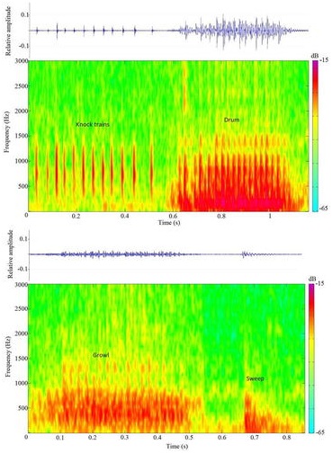 FIG. 4. (Color online) Oscillograms (above) and spectrograms (below, sampling rate 80kHz, hamming window, FFT size = 1024 points, frequency overlap = 50%) of four underwater call types, knock, growl, drum and sweep, identified from recordings of spotted seals (Phoca largha) in Liaodong Bay, China.