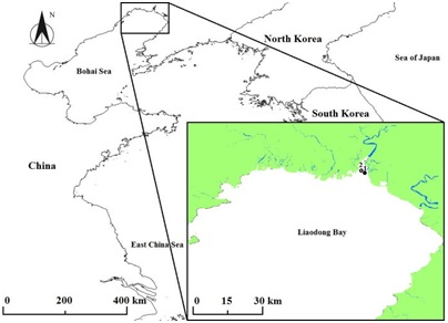 FIG. 1. (Color online) Map showing the morning (1, solid dot) and evening (2, circle) locations where spotted seal (Phoca largha) underwater vocalizations were recorded in Liao River estuary, in Liaodong Bay, China.