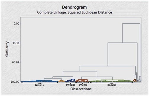 FIG. 3. (Color online) A dendrogram of the underwater vocalizations recorded from spotted seals (Phoca largha) based on hierarchical cluster analysis. Different main clusters (similarity over 95%) are shown in different colors. 704 observations (calls) were analyzed and 548 of these (77.8%) were identified as four different call types (knock, growl, drum, and sweep).