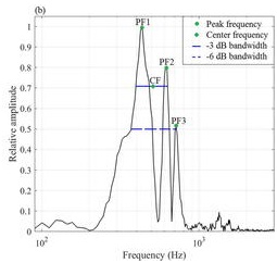 FIG. 2. (Color online) Oscillogram (a) with signal envelope (dotted line) and average energy spectrum (b) examples of spotted seals (Phoca largha) underwater vocalizations recorded in Liaodong Bay, China, showing the vocal parameters measured for acoustic description and definition of the calls: -10 dB duration (τ-10dB ), positive start-up time of oscillation (τPSO ) and negative start-up time of oscillation (τNSO ), top three peak frequencies (PF1, PF2, and PF3), center frequency (CF), -3 dB frequency bandwidth (-3 dB_BW), and -6 dB frequency bandwidth (-6 dB_BW). PF1 and PF2 represent two extreme amplitude points in the -3 dB bandwidth (NumE).