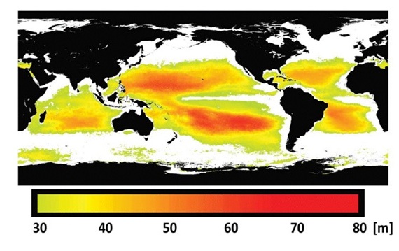 Fig.2 Penetration depth of solar irradiance (sun at zenith) at 360 nm in the global ocean, as gauged by 10% of the surface