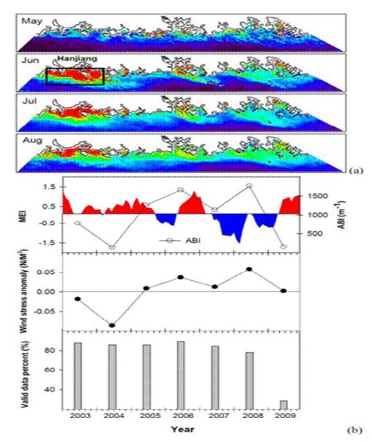 Fig. 1 (a) close-up view of phytoplankton absorption coefficient at 443 nm (Aph) in the nearshore water in May–August;